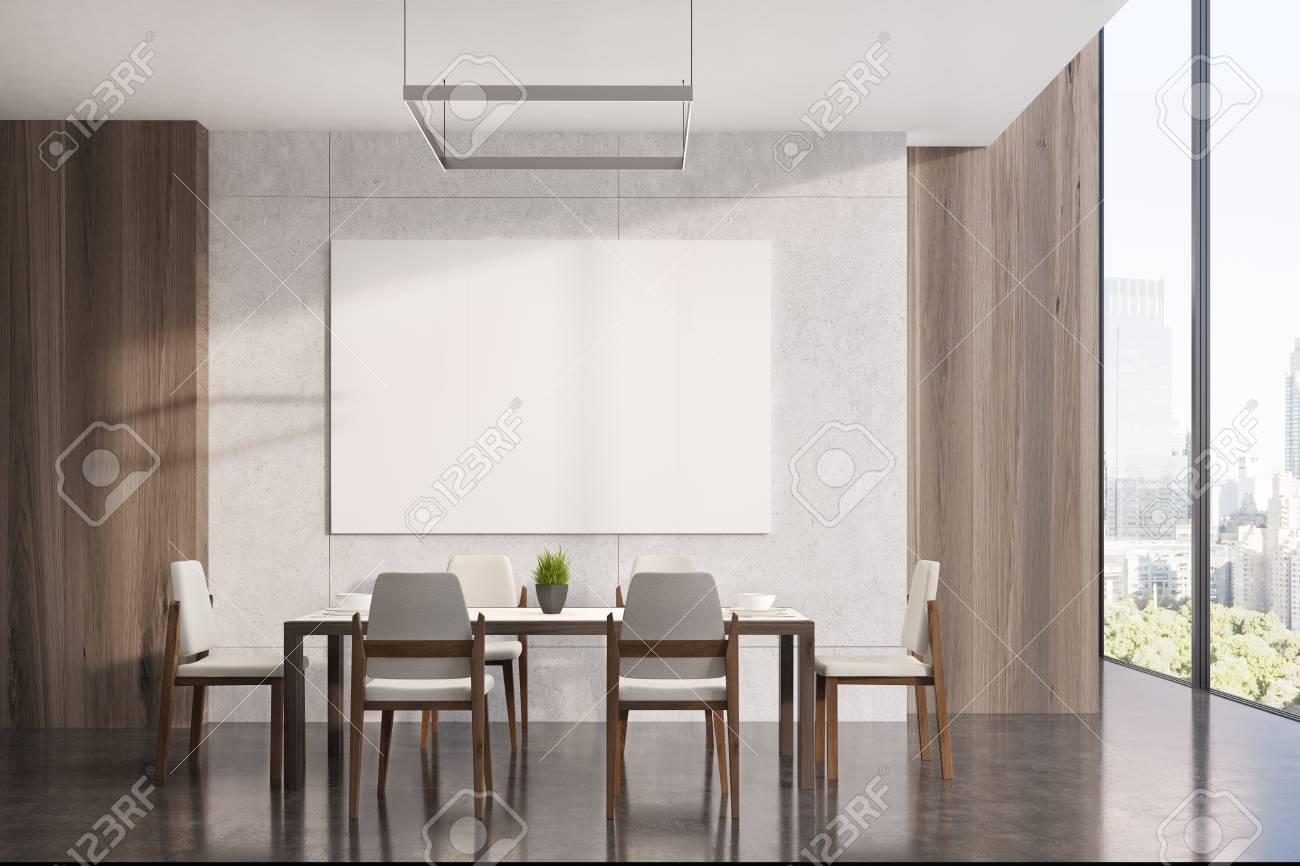Interieur De Salle A Manger En Bois Clair Avec Une Longue Table En Bois Blanc Six Chaises Blanches Autour D Elle Et Une Grande Affiche Horizontale A